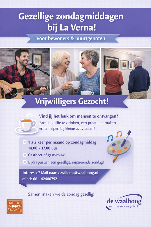Op zondagmiddag opent Woonzorgcentrum La Verna haar deuren voor de wijk. De huiskamer wordt dan een gezellige ontmoetingsplek waar bewoners en buurtbewoners samenkomen voor contact, koffie en kleine activiteiten. Jij bent het warme welkom dat het verschil maakt. Met jouw aandacht en open houding voelen mensen zich meteen thuis.