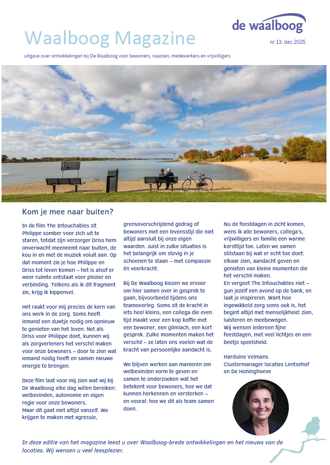 Lees nu de nieuwste editie van de nieuwskrant van De Waalboog – december 2025. Deze krant staat weer boordevol leuke verhalen voor iedereen en wordt met zorg gemaakt met en voor bewoners, naasten, medewerkers en vrijwilligers per locatie.